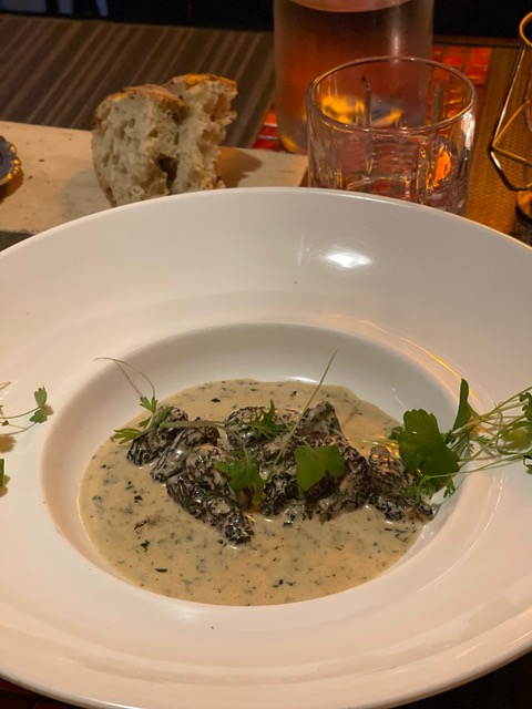 I began with fleur de courgette, grilled zucchini flower stuffed with ricotta, lemon and Parmesan, served in thinly sliced zucchini. It’s delicate and light, a fine appetizer choice. I was not, however, prepared for the love bomb that awaited in my next dish. A white bowl with a wide brim arrived with grilled morels bathing in a tarragon cream sauce. The mushrooms were tender and meaty, and the sauce was well-balanced. I swooned after my first bite, then tried to eat the rest as slowly as I could. When all the mushrooms were gone, I used the warm slices of country bread I had been given to sop up every last drop of sauce.
